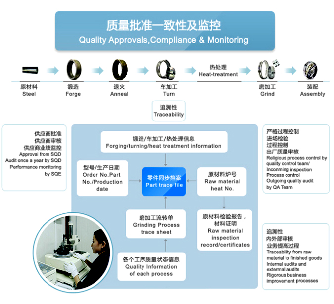 我們對原料供應(yīng)商精挑細選,需經(jīng)過嚴謹?shù)墓?yīng)商批準程序與進貨檢驗程序才能供貨,確保我們產(chǎn)品質(zhì)量的一致性。我們的原材料均符合國家行業(yè)標準,原材料鋼材以優(yōu)質(zhì)模鑄鋼為主。高純凈的模鑄軸承鋼材可以有效地提高軸承的使用壽命、確保軸承使用的高可靠性,降低客戶端不可預測的停機率。針對原材料和外協(xié)件的質(zhì)量,公司制訂了嚴格規(guī)范的進貨檢驗作業(yè)程序文件,其中包括原材料的化學成份分析、高低倍金相組織檢驗以及外協(xié)件理化分析等項目的檢驗,不折不扣的確保高質(zhì)量的原材料用于制造HMB高品質(zhì)的軸承產(chǎn)品。
